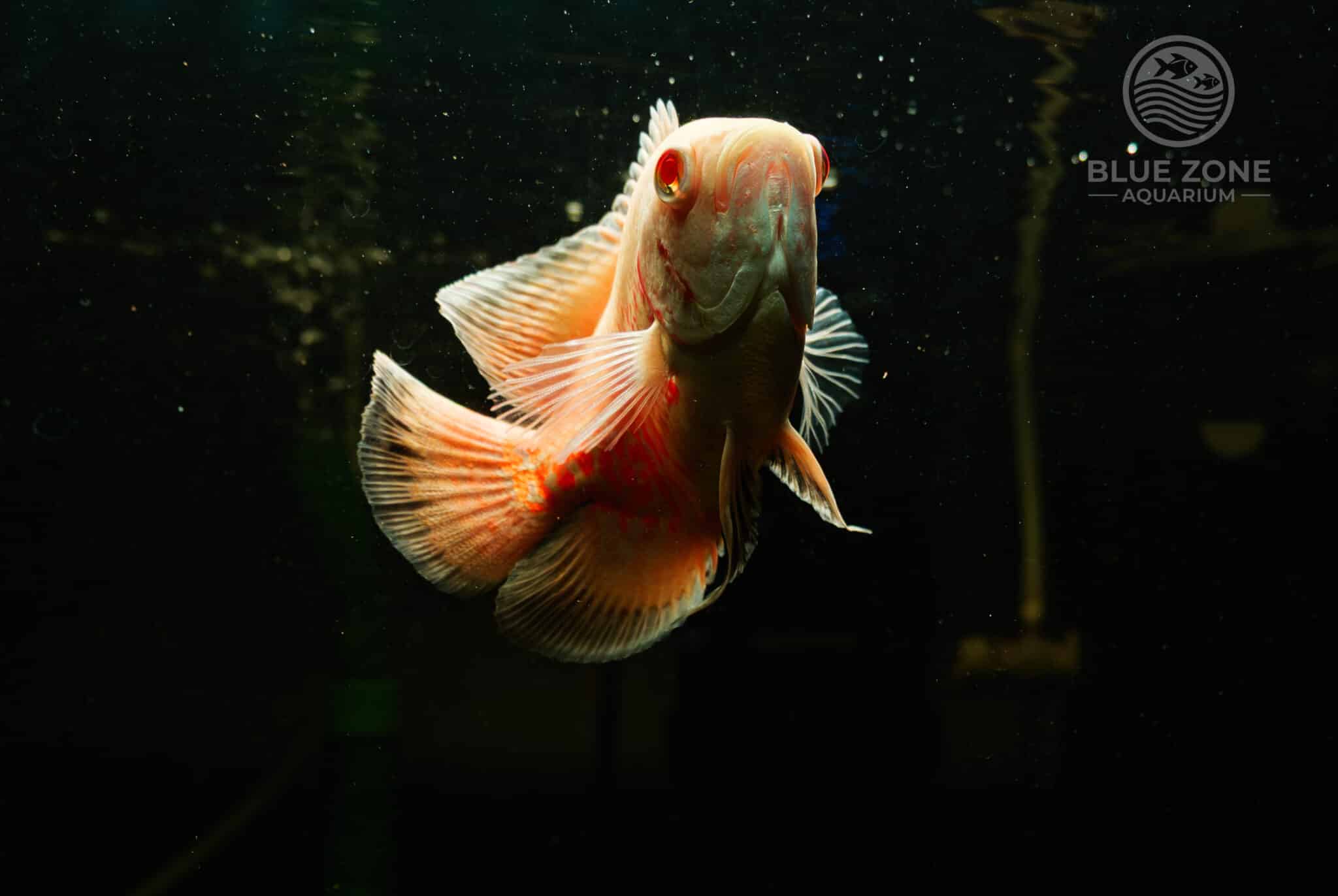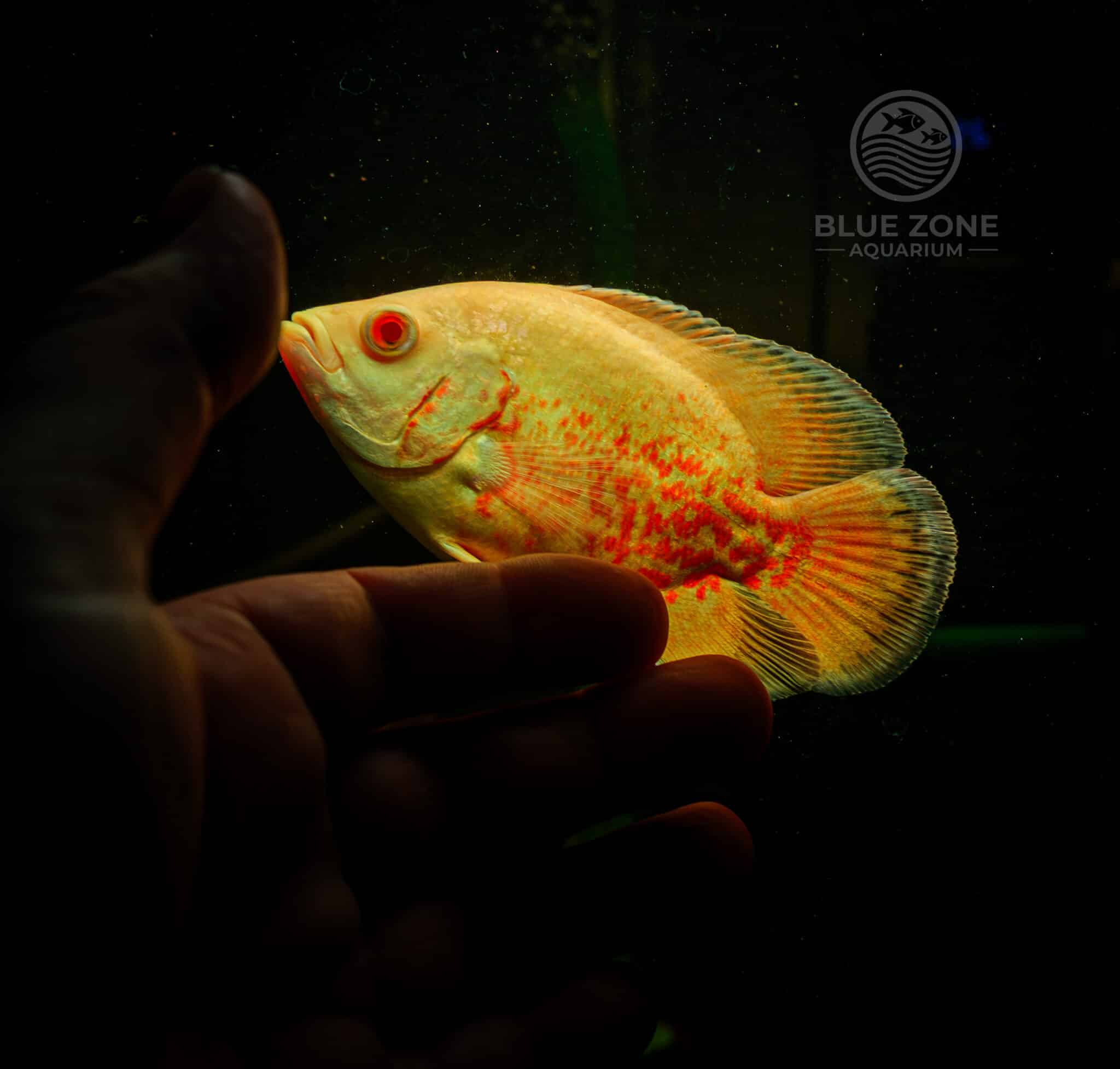 Fred is a thick-bodied 5 inch Chili Oscar with strong orange-red patterning over a warm gold base. He is alert, interactive, and comfortable at the front of the aquarium.