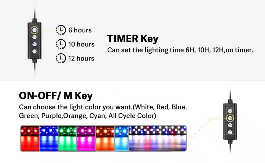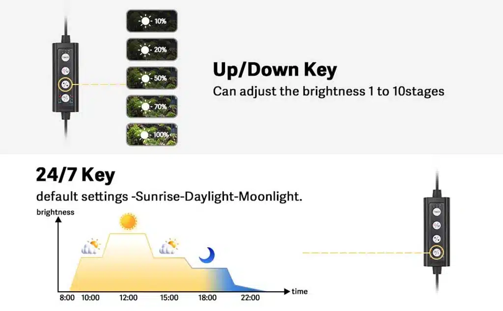 Lighting duration can be set to 6, 10, or 12 hours with multiple brightness levels available to suit different aquarium setups.