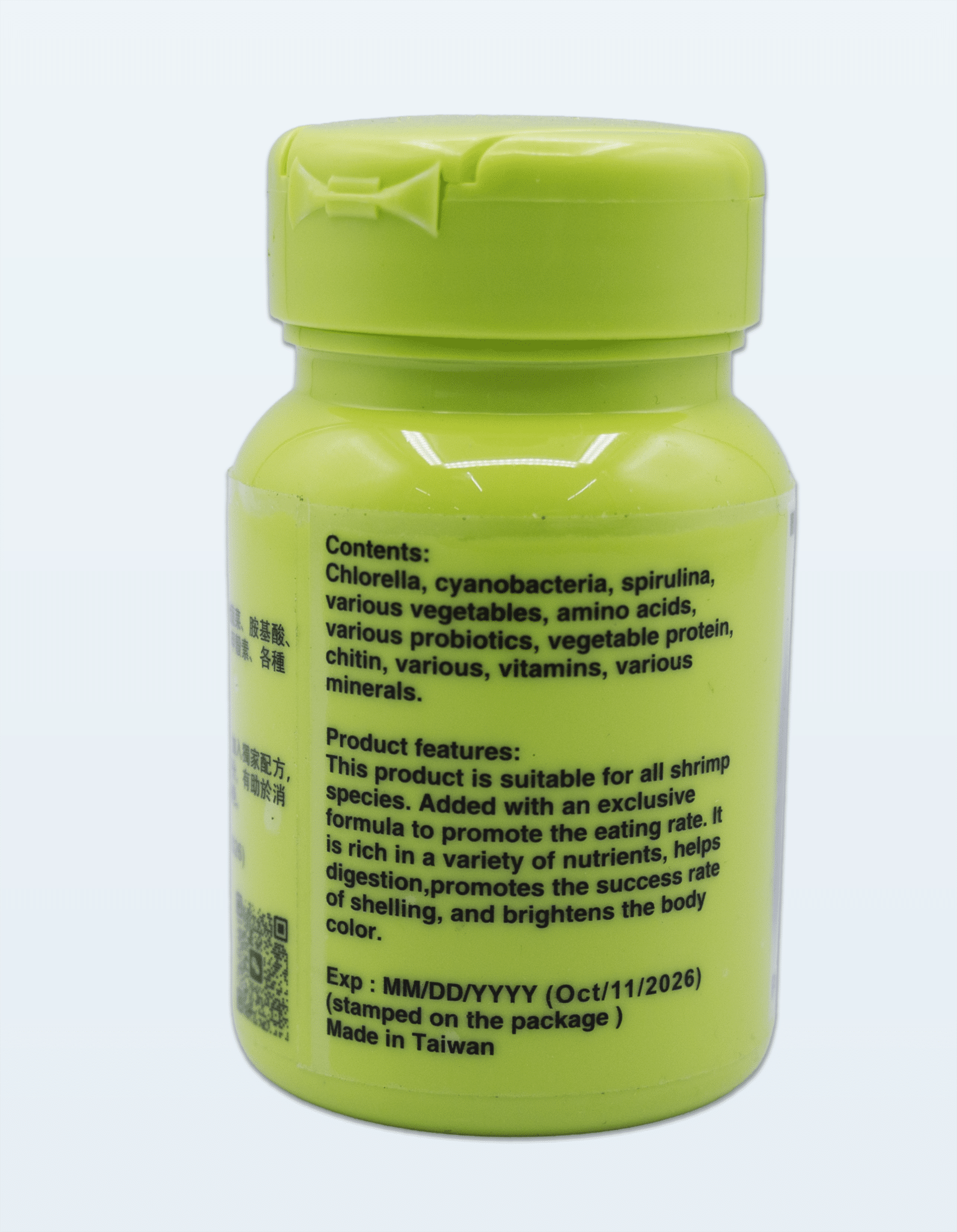 The formula includes a blend of natural algae and nutrient sources such as cyanobacteria, chlorella, spirulina, and amino acids, which provide essential proteins, vitamins, and trace nutrients that shrimp require for molting, shell development, and overall vitality.